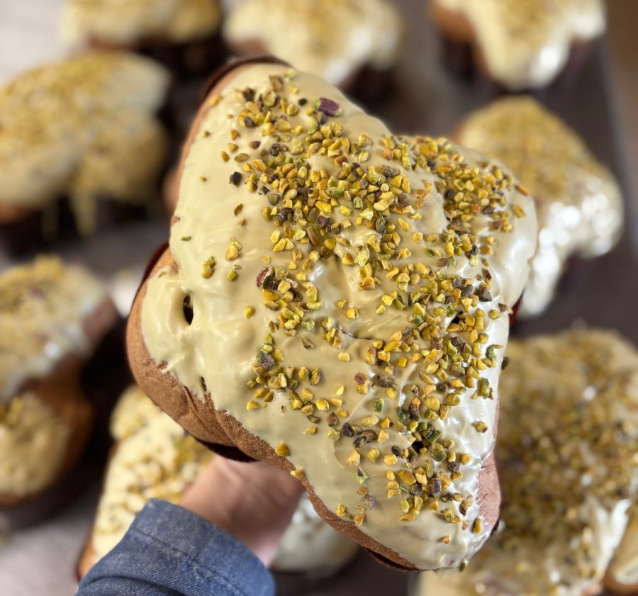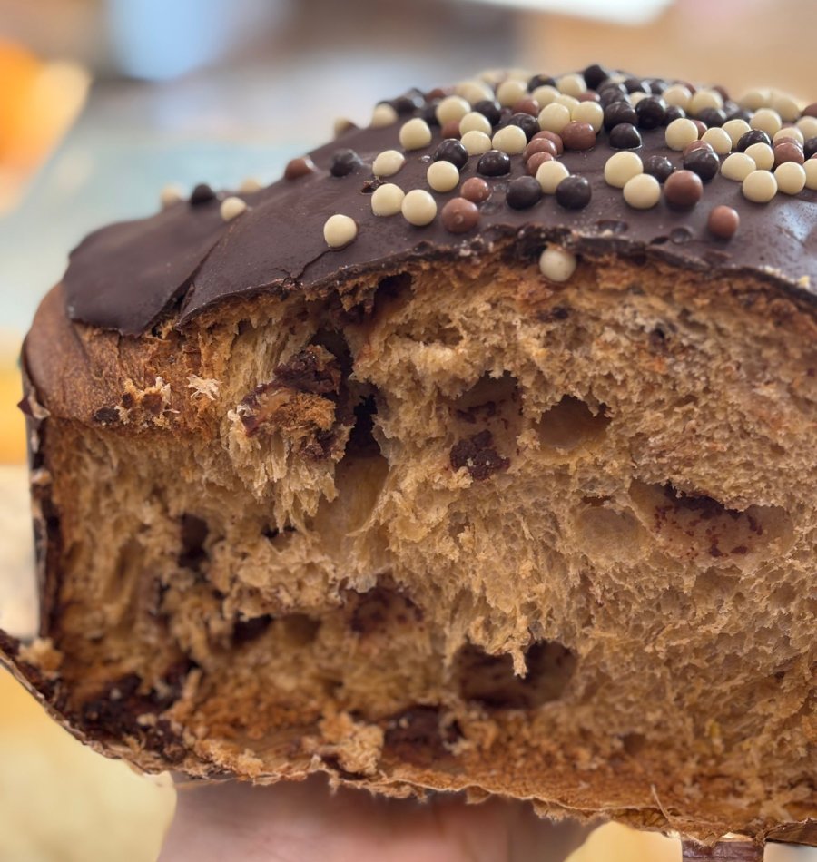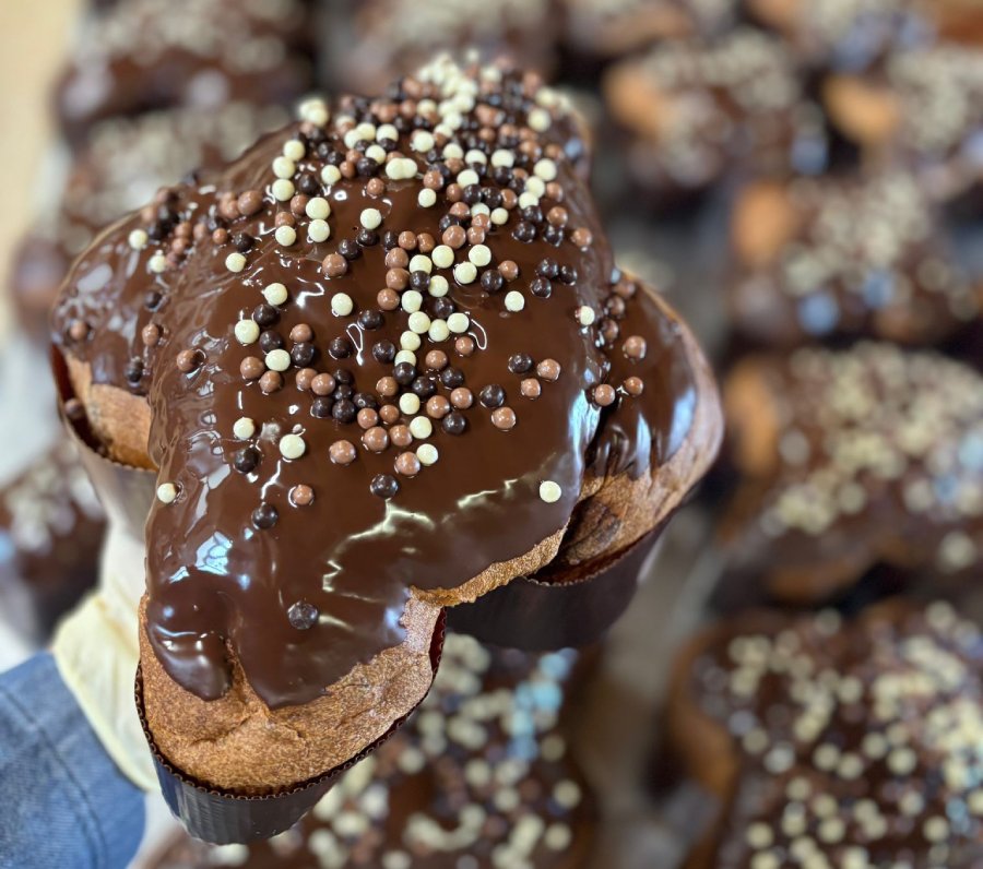 “Prima di tutto prepariamo le colombe tradizionali, con arancia e canditi. Poi quelle con cioccolato fondente classico e quelle con cioccolato e pera, che sono diventate un po’ il nostro cavallo di battaglia e piacciono moltissimo ai nostri clienti, e infine quelle con farcitura al pistacchio. Quest’anno poi facciamo anche quella alla gianduia, che viene inserita direttamente nell’impasto, accompagnata con gocce di cioccolato al latte; e il prodotto finale viene poi glassato al cioccolato e guarnito con palline di cioccolato croccanti, bianco e nero. La nostre colombe hanno la pezzatura di 750 grammi, ma c’è la possibilità di acquistare anche quelle piccole, con un peso di 120 grammi”