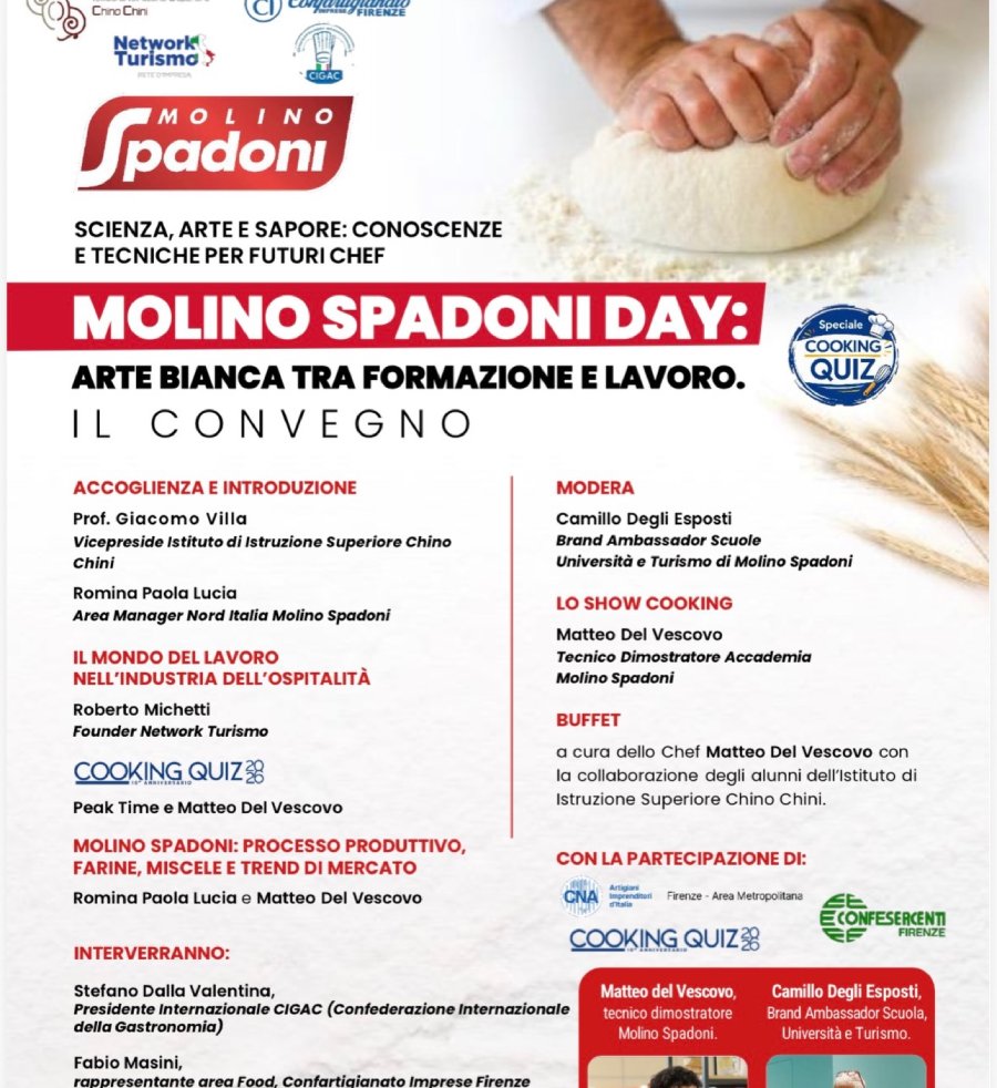 La giornata – coordinata da Camillo Degli Esposti, brand ambassador scuole, università e turismo per Molino Spadoni – si aprirà con un convegno intitolato “Arte bianca tra formazione e lavoro”. Dopo i saluti introduttivi di Giancarlo Villa, vicepreside dell’Istituto, accompagnato dai professori Michele Occhibove e Francesco Leanza, docenti di enogastronomia, e dal maitre e sommelier Umberto D’Alessandro, è in programma l’intervento di Roberto Michetti, Founder di Network Turismo, dedicato alle opportunità di carriera nel settore dell’accoglienza turistica, a cui seguirà la testimonianza di Fabio Masini, rappresentante Area Food di Confartigianato Imprese Firenze.