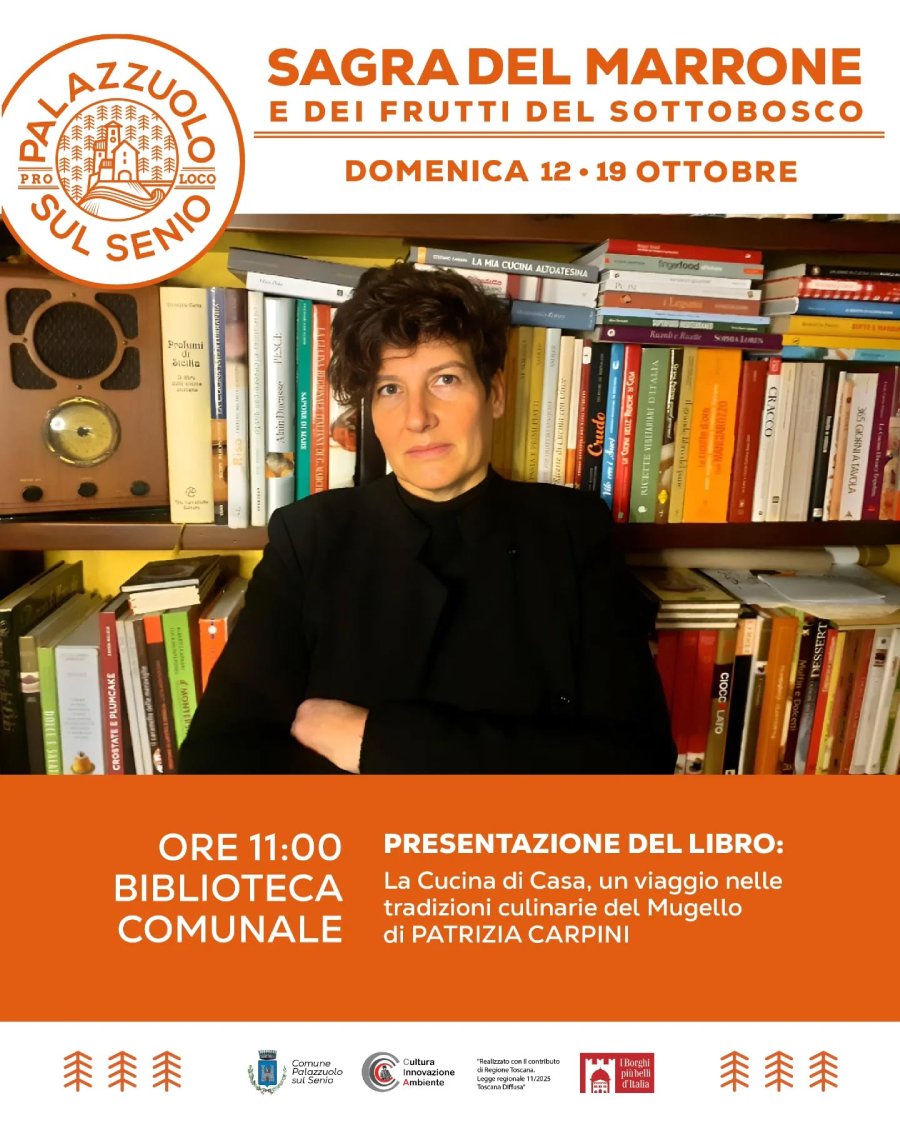 PALAZZUOLO SUL SENIO – Doppio appuntamento in Alto Mugello per Patrizia Carpini, che domenica 12 e domenica 19 Ottobre, in occasione della “Sagra del marrone e dei frutti del sottobosco” di Palazzuolo sul Senio, presenterà il suo libro “La cucina di casa, un viaggio nelle tradizioni culinarie del Mugello”, edito dal Filo.