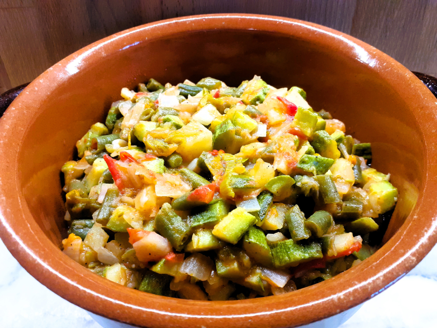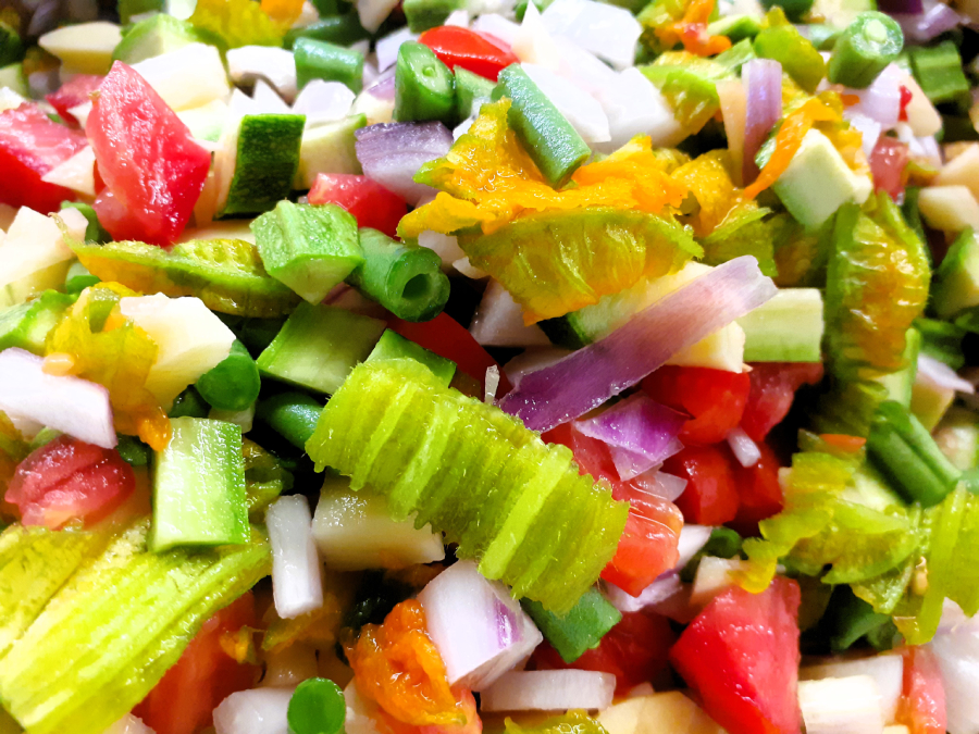 Tagliate a pezzi piccolissimi le patate e i fagiolini (sono le verdure che impiegano più tempo per la cottura). Tagliate a striscioline i fiori di zucca e in quadratini tutte le altre verdure. Mettete l’olio in un tegame di alluminio capiente e unite tutte le verdure. Accendete il fuoco e salate immediatamente (così facendo l’acqua di vegetazione delle verdure uscirà e faciliterà la cottura).